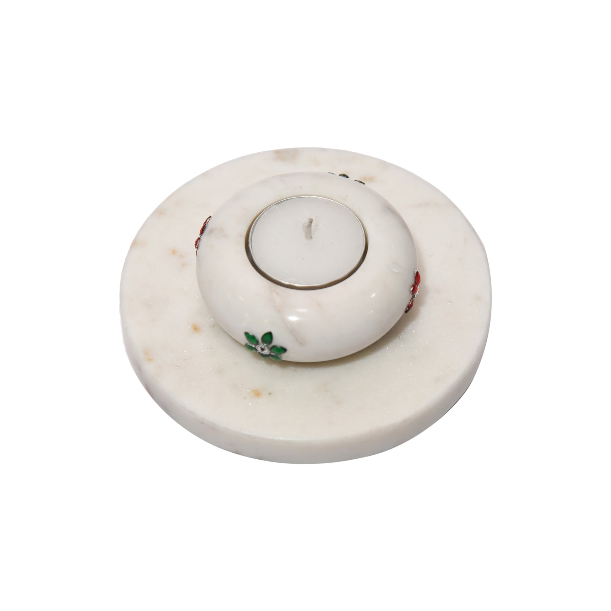 This exquisite white marble candle holder features a beautifully handcrafted round base adorned with an elegant green and red flower design. Its sophisticated aesthetic enhances any decor, making it a perfect centerpiece for both modern and traditional settings. Ideal for creating a warm ambiance, this candle holder is not only functional but also serves as a stunning decorative piece.